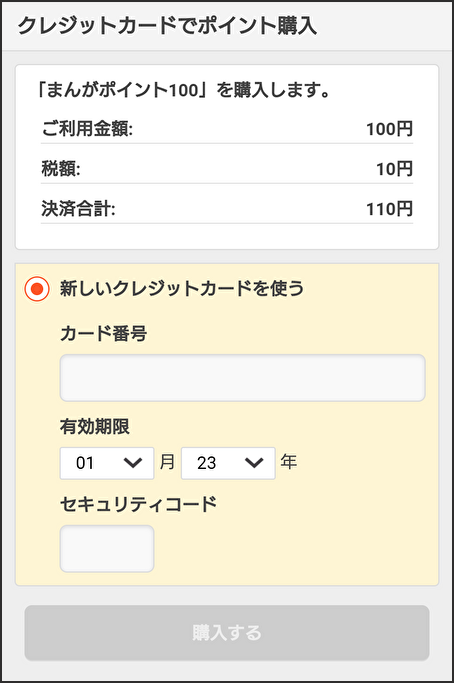 購入ボタンをタップすると、クレジットカードのカード番号を入力できるページへ移動します。