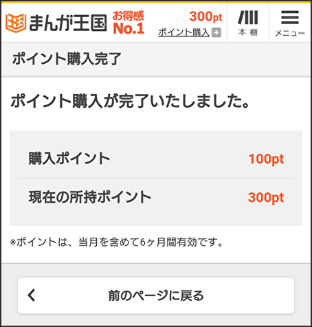 その後、ポイント購入完了画面が表示されますので、購入したポイントを確認しましょう。