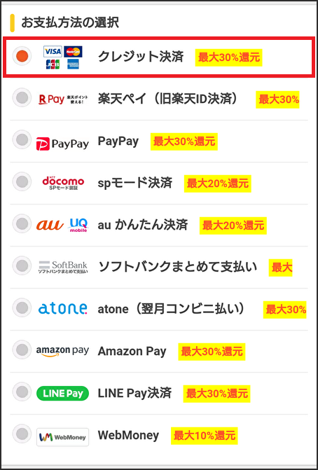 但し、会員登録時の認証方法によってはクレジットカード決済の一択となる場合があります。
