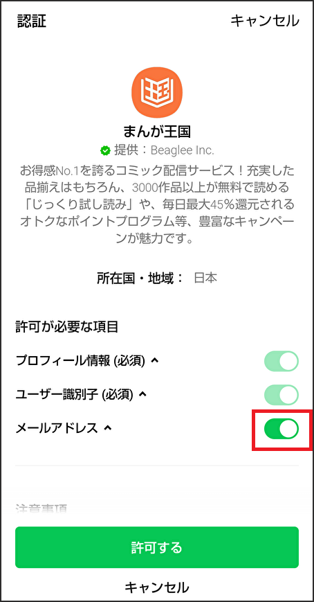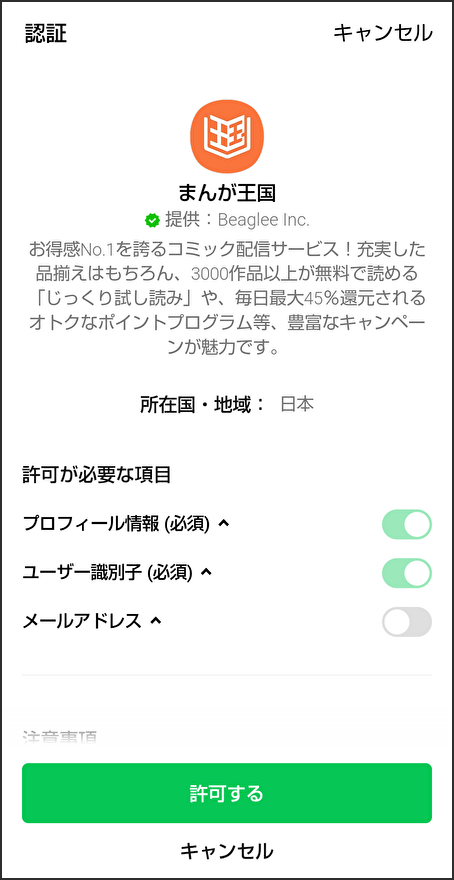 単純にLINEのアカウントを利用してまんが王国の会員になるだけの事だけですので、現在利用しているLINEの情報全てがまんが王国側に渡るわけではないのです。
