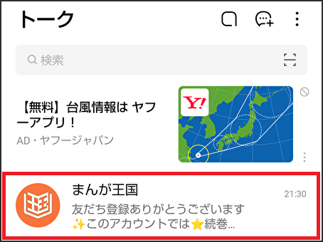 またまんが王国をLINEで登録すると、トークにまんが王国が追加される仕組みとなっています。