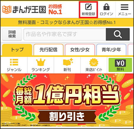 まずはまんが王国のサイト上部より「新規登録」をタップします。