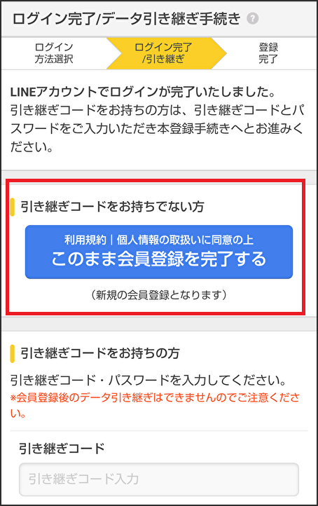 その後は会員登録画面へ移動しますので、もし以前使っているアカウントがあれば引き継ぎ出来ますが、今回は新規登録として「引き継ぎコードをお持ちでない方」のボタンを押しましょう。
