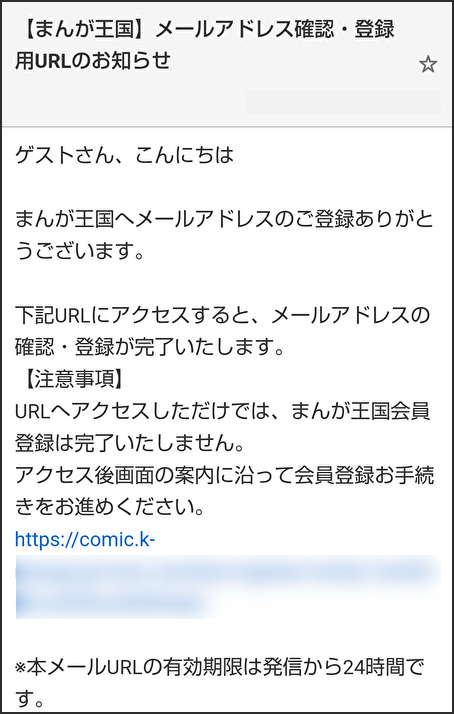 問題なくメールが届いていればメールの中身を確認すると、まんが王国へ登録する為のURLが記載されているので、URLをタップします。