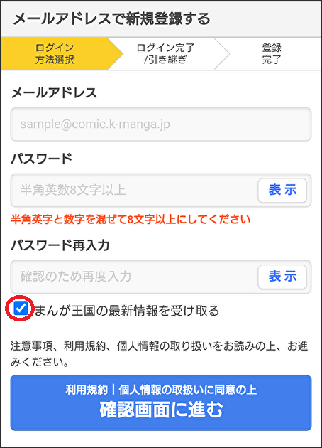 この時に、まんが王国からお知らせメールを受け取りたくない方は「最新情報を受け取る」のチェックを外しておきましょう。