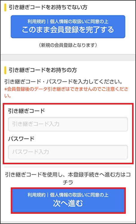 新規会員登録の画面になるので、ココで引き継ぎコードを入力します。必ず「引き継ぎコードをお持ちの方」の箇所に入力するようにしてください。