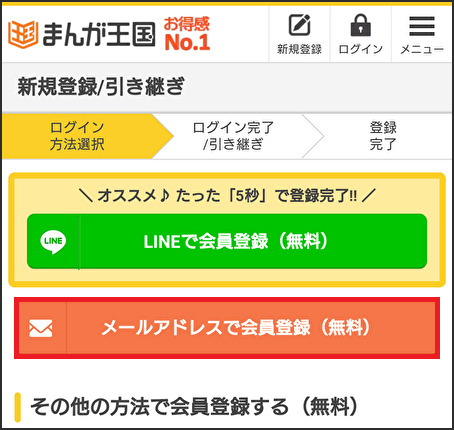 ログアウト後、まんが王国公式サイトTOPページの上部にある「新規登録」をタップします。